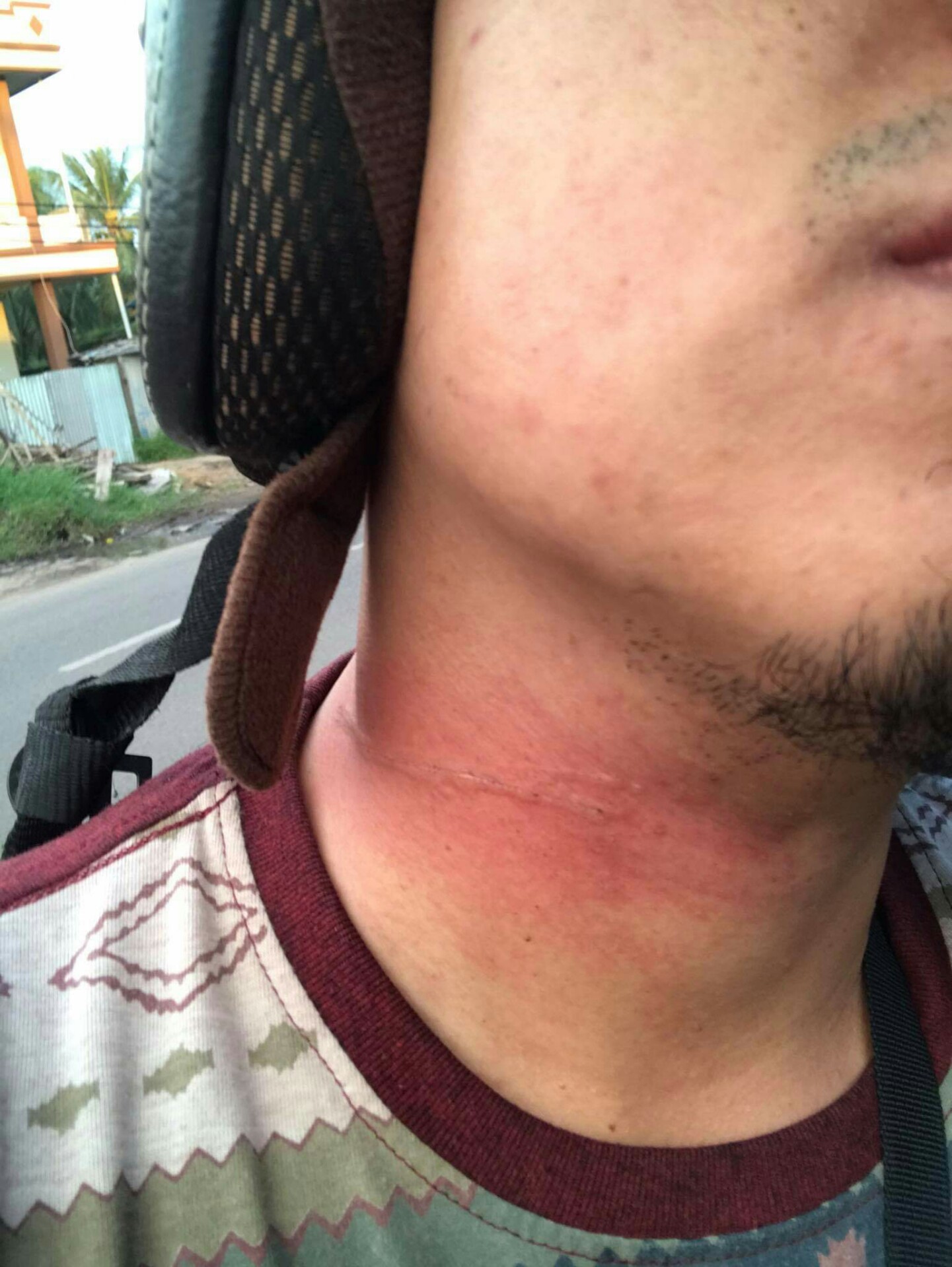 tiba tiba ada tali benang melilit lehernya, sehingga mengalami luka goresan seperti kena sayat pisau.