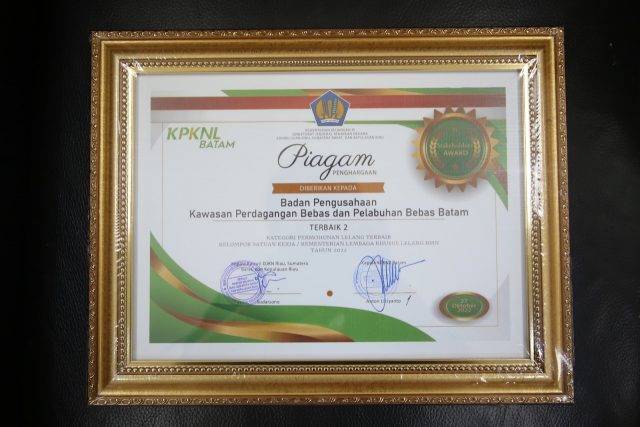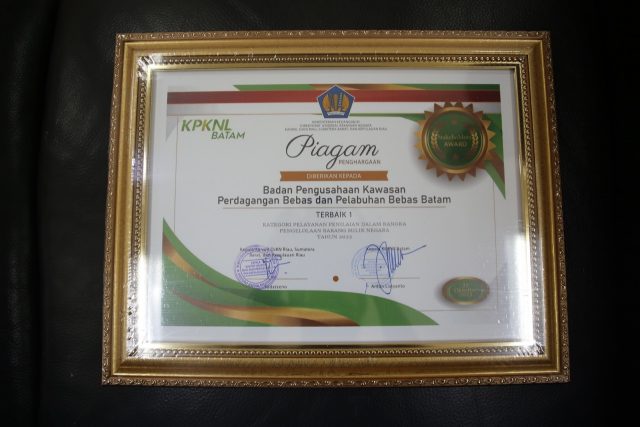 Penghargaan kepada BP Batam diserahkan langsung oleh Kepala Kanwil Direktorat Jenderal Kekayaan Negara (DJKN) Riau, Sumbar, dan Kepri (RSK), Ditjen Kekayaan Negara, Kementerian Keuangan RI, Sudarsono.