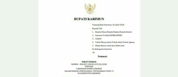 Surat edaran Bupati Karimun tentang larangan mudik lebaran Nomor: 300/SET-Covid-19/IV/02/2020 tersebut menindaklanjuti instruksi Menteri Dalam Negeri Republik Indonesia Nomor 1 Tahun 2020.