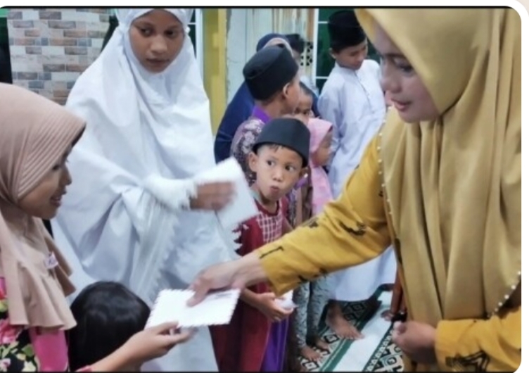 Donna.S. saat memberikan santunan pada anak yatim di Masjid Al-Muttaqin Jl Kuda Laut Telaga Tujuh, Kecamatan Karimun” Jumat 15/4.