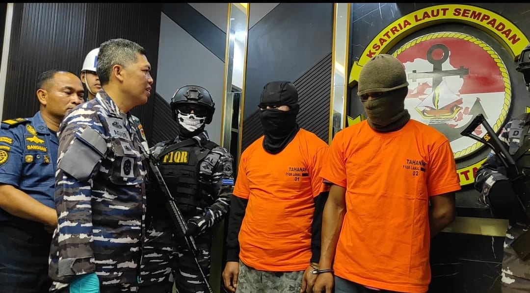 Tersangka AM dan AG saat ditanyai Danlanal Bintan Kolonel Laut (P) Dr. Eko Agus Susanto, S.E., M.M.