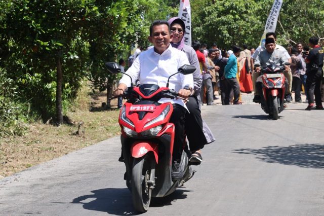 Usai peresmian, Gubernur Ansar berboncengan motor bersama Ketua TP-PKK Provinsi Kepri Hj. Dewi Kumalasari Ansar. Meninjau langsung hasil pembangunan jalan di Bintan pesisir. F. Yn.