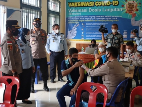 Kapolres Bintan AKBP Tidar Wulung Dahono, S.H, S.I.K., M.H, didampingi Kadivpas Kanwil Kemenkumham Dwi Nastiti, Kalapas Narkotika Kelas II A Tanjung Pinang Wahyu Prasetyo beserta PJU Polres Bintan melihat langsung proses vaksinasi kepada para narapidana (napi) yang berada di lapas tersebut.