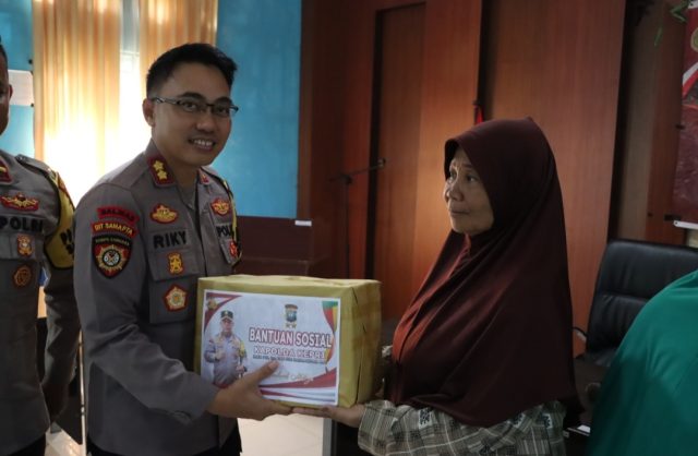 Kapolres Bintan AKBP Riky Iswoyo, memberikan bingkisan sembako Kepada warga. F. Alson.