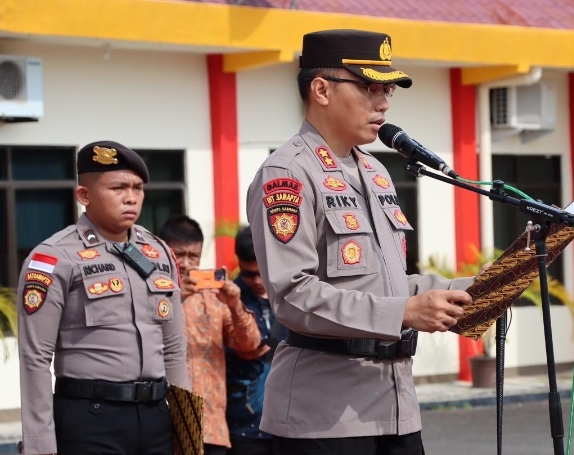 AKBP Riky Iswoyo, S.I.K., M.M., Kapolres Bintan saat pimpin upacara serah terima jabatan pejabat Polres Bintan.