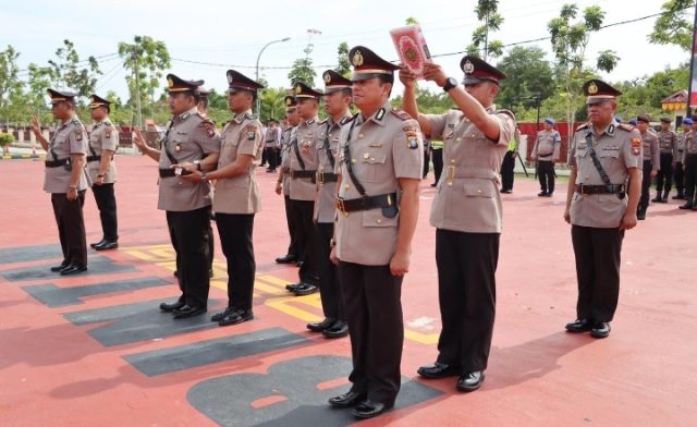 Bintan, Kepri – Kapolres Bintan AKBP Riky Iswoyo, S.I.K., M.M., memimpin upacara serah terima jabatan (sertijab) pejabat utama Polres Bintan yang berpindah tugas dari Polres Bintan ke kesatuan lainnya yang dilaksanakan di lapangan apel Polres Bintan, Sabtu (06/05/2023).