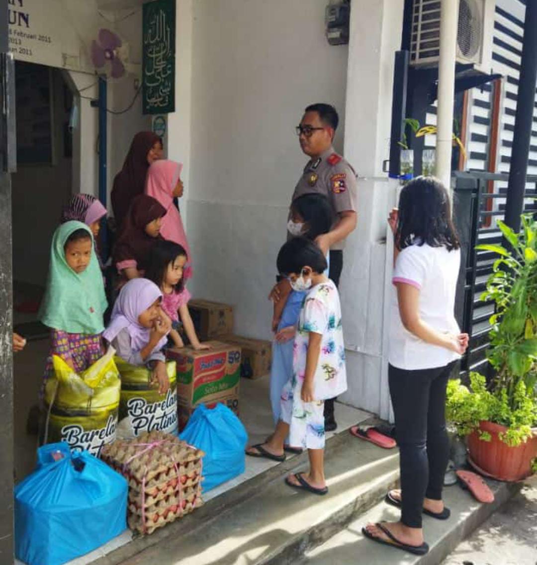 Kompol Andri Kurniawan saat mengajarkan anaknya yang masih berusia dini untuk berbagi di Panti Asuhan Qurrotu A’Yun Kota Batam, Jum’at 15/04/2022 (Foto Pit)