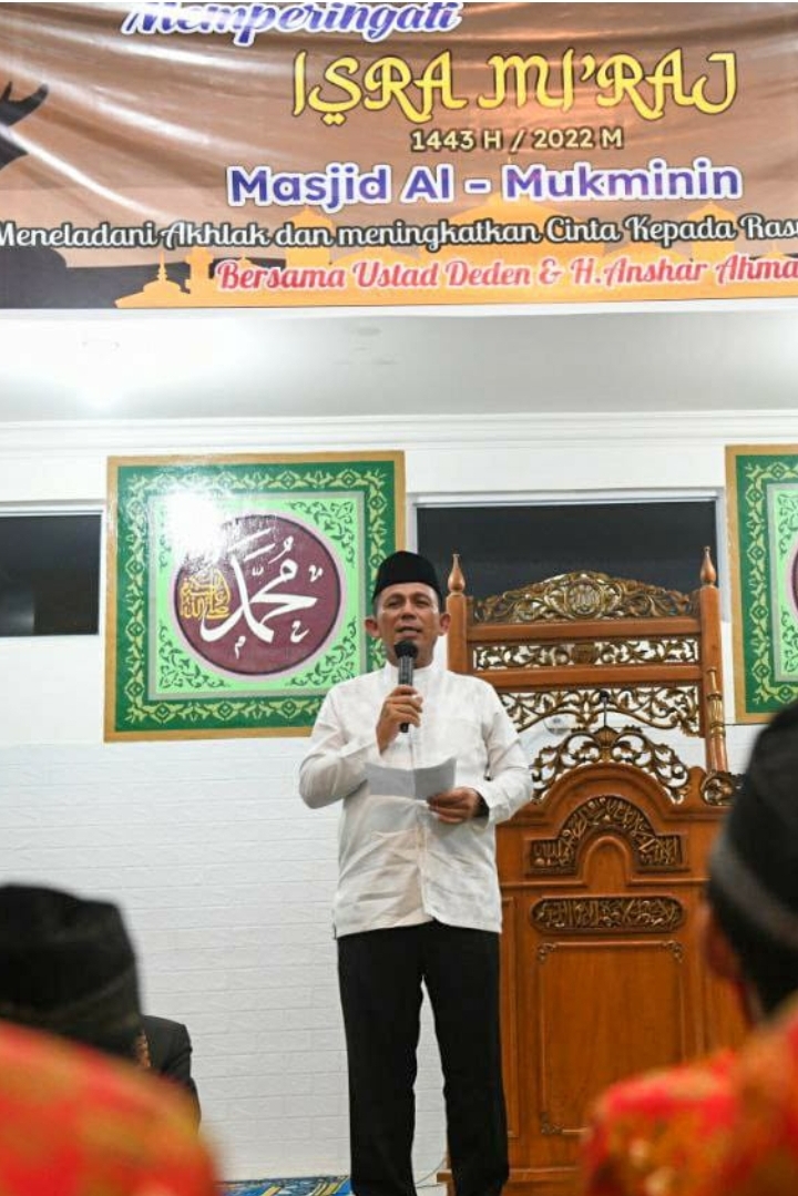 Ansar menyampaikan sambutan saat hadiri Isra’ Mi’raj di Masjid Al-Mukminin, Rabu 09/03/2022 (Fiti Diskominfo Kepri)