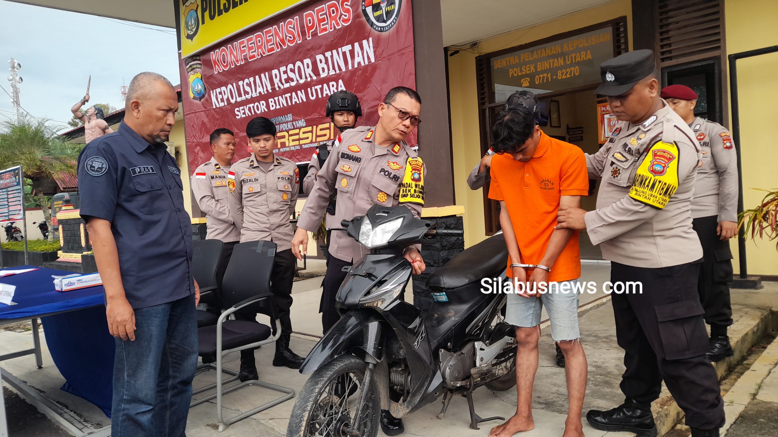 Kapolsek Bintan Utara, AKP Monang Silalahi, S.H., bersama jajaran anggota kepolisian, memperlihatkan pelaku dengan motor hasil curiannya, Senin 18/11/2024 (Foto: Patar Sianipar)
