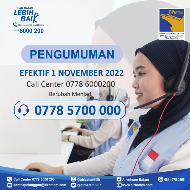 Batam, Silabusnews.com – Pihak Corporate Air Minum Batam Hilir, menginformasikan kepada pelanggan setia SPAM Batam terkait adanya pergantian nomor Call Center. Adapun EfektifSelasa 1 November 2022, Nomor Call Center SPAM Batam berubah menjadi (0778) 5700 000.