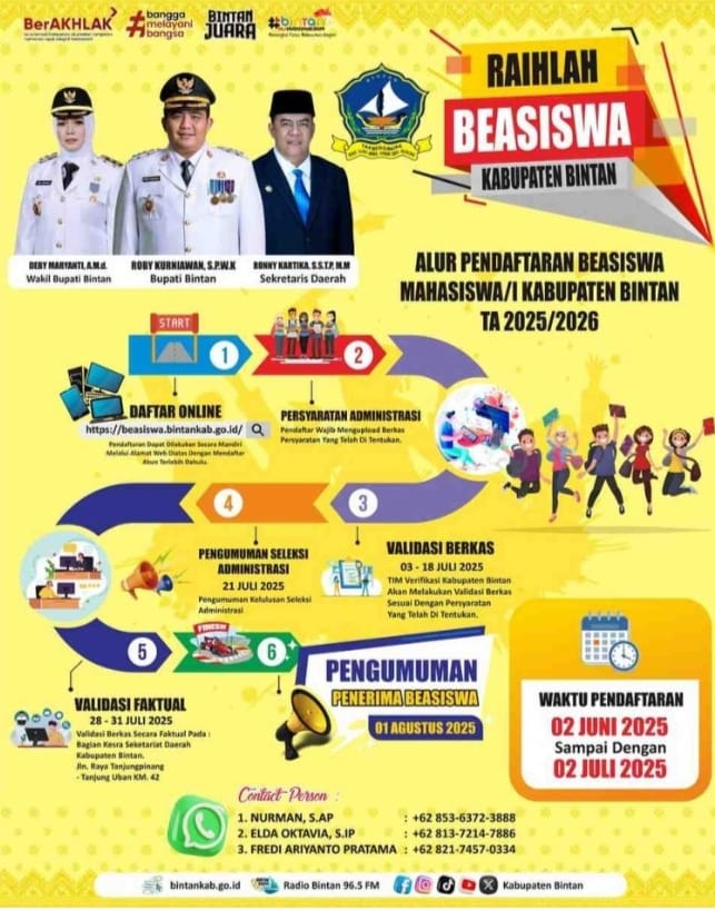 Bintan, Kepri – Bupati Bintan Roby Kurniawan, komitmen dengan janji politiknya saat menjelang pilkada kemaren. Pemerintah Kabupaten Bintan, kembali membuka peluang beasiswa mahasiswa, bagi warga Bintan yang akan, dan sedang menempuh pendidikan di Perguruan Tinggi Tahun Akademik 2025-2026, dan jadwal pendaftaran dimulai, Senin 2 Juni sampai Rabu, 2 Juli 2025..
