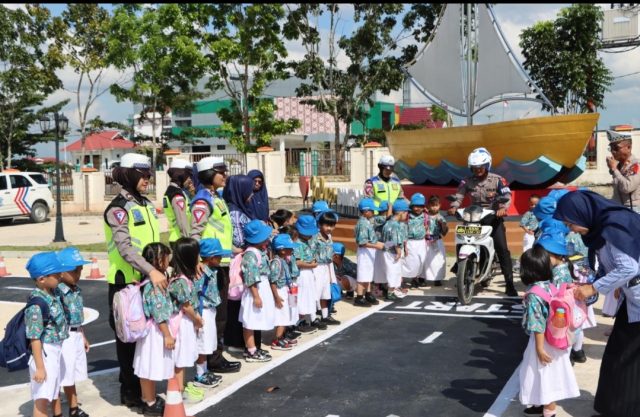 Tampak Kasatlantas dan sejumlah personil Polisi lalu lintas memberikan pemahaman kepada anak-anak sejak usia dini tentang tata tertib berlalu lintas, termasuk pengenalan rambu-rambu lalu lintas yang sangat penting kegunaannya untuk keselamatan mereka di jalan.