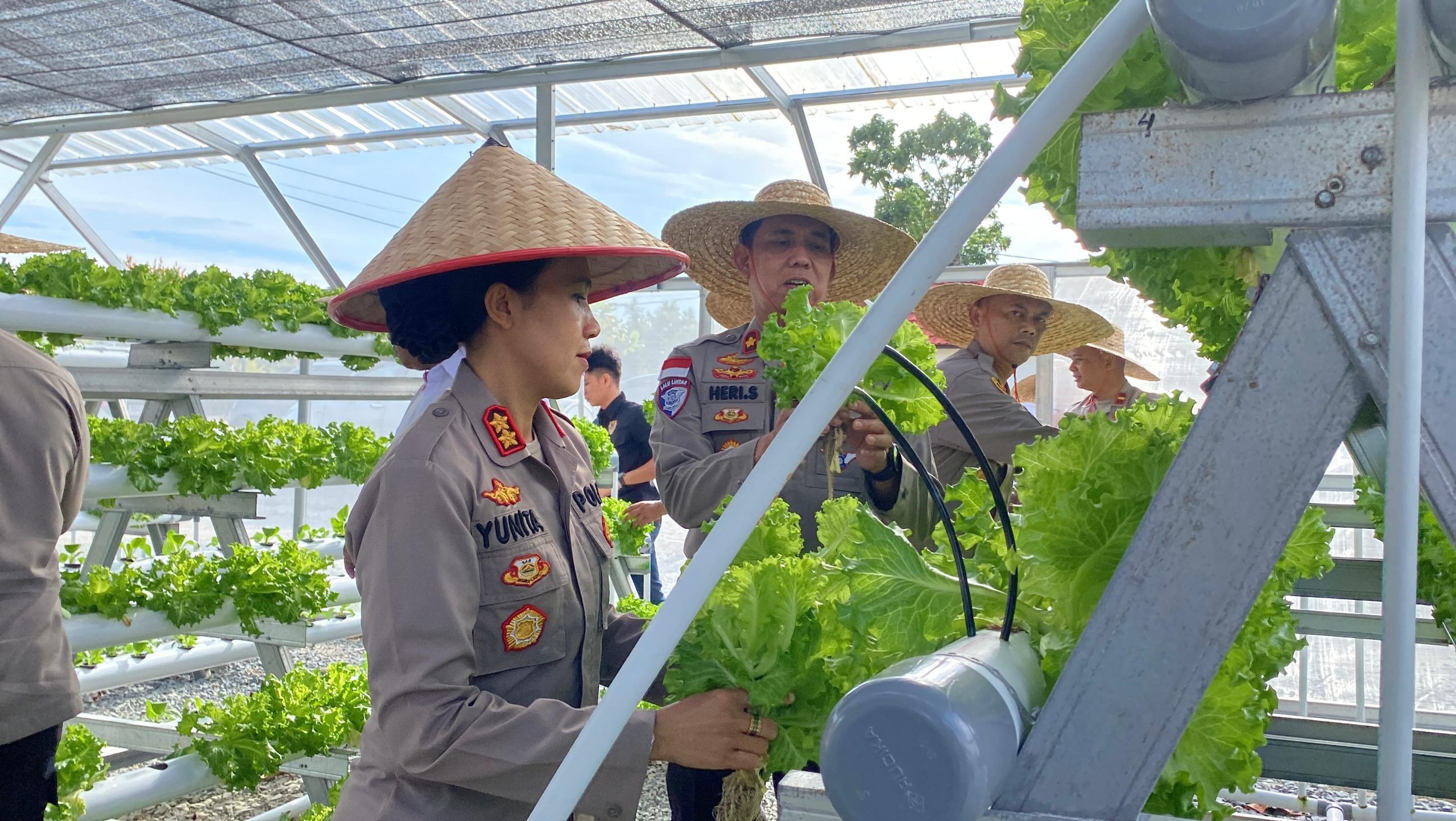 Kapolres Bintan AKBP Yunita Stevani S. I. K., M. Si., saat melakukan panen sayur hidroponik tahap II, di pekarangan Pangan Bergizi, Polres Bintan (F_Humas Polres Bintan)