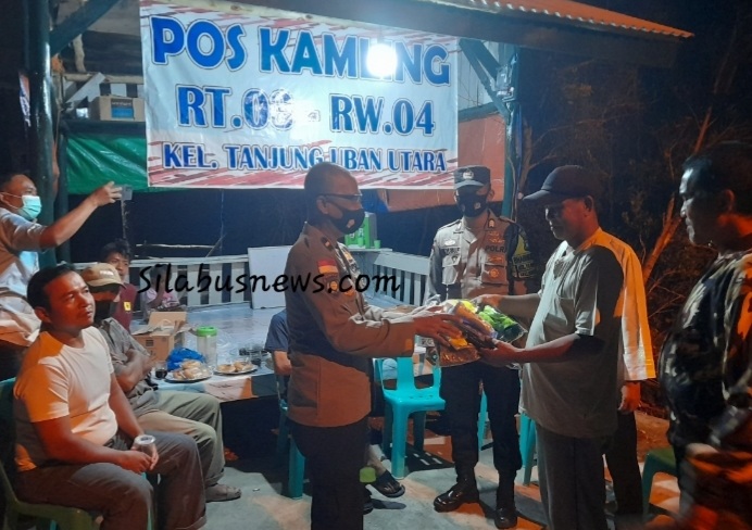 Kanit Bhabinkamtibmas Polres Bintan, IPDA Mursalim saat menyerahkan bantuan peralatan siskamling kepada ketua RT 03,didampingi Bhabinkamtibmas kelurahan Tanjunguban Utara, Kamis 10/03/2022 (Foto Patar Sianipar)