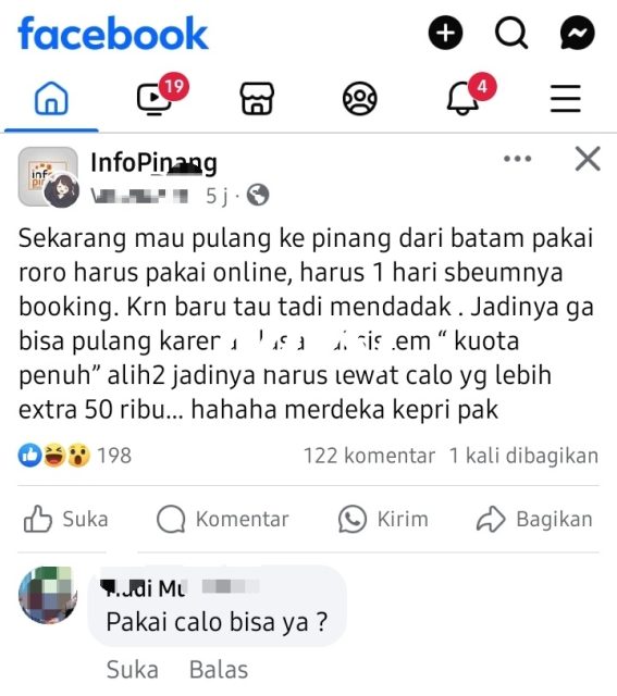Di media sosial tersebut menyatakan sebagai berikut, “Sekarang mau pulang ke pinang dari batam pakai roro harus pakai online, harus 1 hari sbeumnya booking. Krn baru tau tadi mendadak . Jadinya ga bisa pulang karena alasan di sistem “ kuota penuh” alih2 jadinya harus lewat calo yg lebih extra 50 ribu… hahaha merdeka kepri pak,” tulisnya.